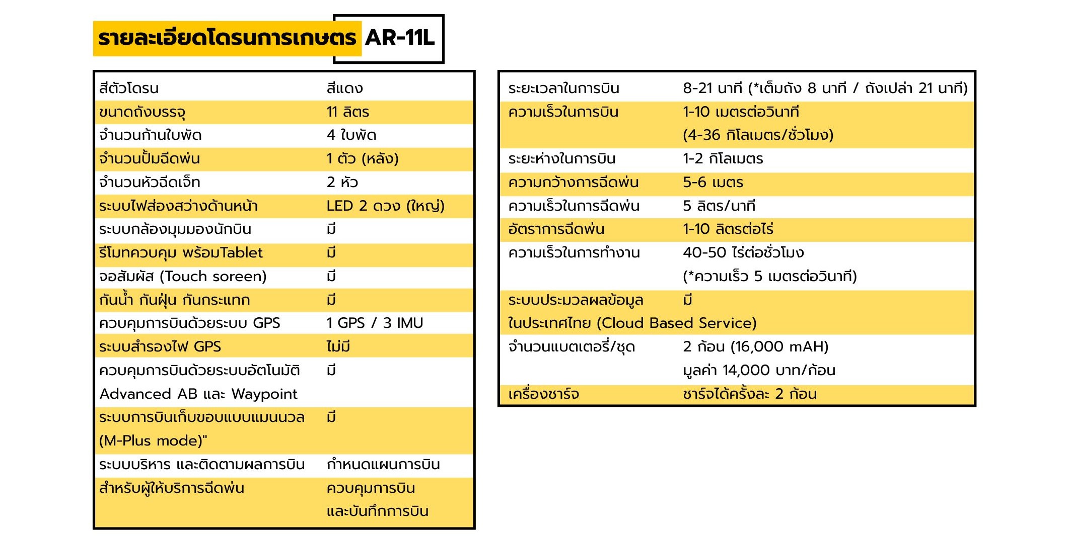 โดรนการเกษตรขนาด 11 ลิตร ออกแบบเพื่อการพ่นที่แม่นยำ ประหยัดเวลา และใช้งานง่าย เหมาะสำหรับแปลงเกษตรขนาดเล็ก–กลาง ประกอบในประเทศไทย ภายใต้การควบคุมมาตรฐานอุตสาหกรรม MIT & dSURE อุปกรณ์ในชุดประกอบด้วย